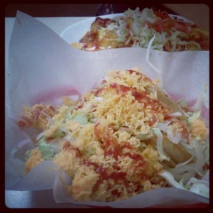 Basically, it sucks. At least as a taco place. They only have two meats: chicken or beef. The beef is ground up and tasteless. The chicken is dry. The hot salsa isn’t as hot as the mild Taco Bell packets. AND, they put a pile of cheddar cheese on each taco. Blaspheme!